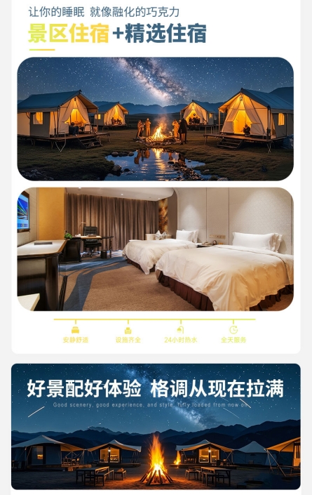 【奢享品质酒店】2晚景区内住宿+1晚唐布拉营地+5晚四钻+1晚舒适酒店。